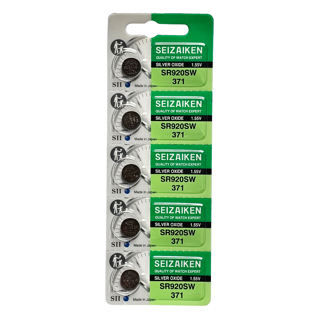 BATERIA OXIDO DE PLATA SEIZAIKEN (FABRICADA POR SEIKO) 371 (SR920SW) DE 1.55 V / CAPACIDAD 35 mAh / BLISTER CON 5 PILAS.